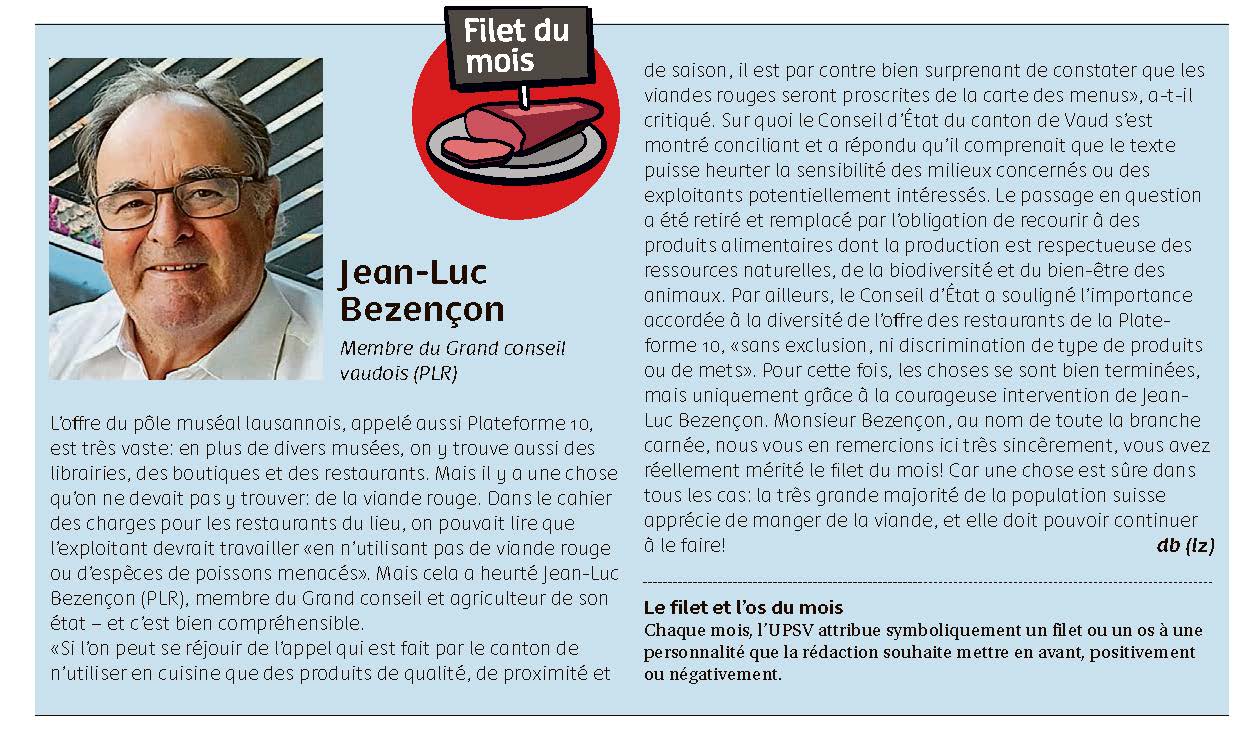 Libre choix sans paternalisme : Jean-Luc Bezençon, membre du Conseil cantonal vaudois, est un défenseur courageux de la liberté de choix pour nous, consommateurs, dans la composition de notre menu. Il s'est défendu avec succès contre les tentatives des autorités de patronner les visiteurs des restaurants du quartier des arts de la Plateforme 10 à Lausanne. En retour, le magazine "Viande et Traiteurs" lui a décerné le "Filet du mois". L'homme le méritait.